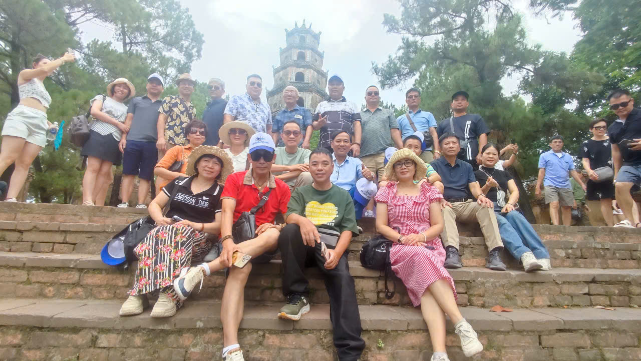 Đoàn tham quan và dâng hương tại chùa Thiên Mụ – biểu tượng tâm linh và kiến trúc đặc trưng của xứ Huế.